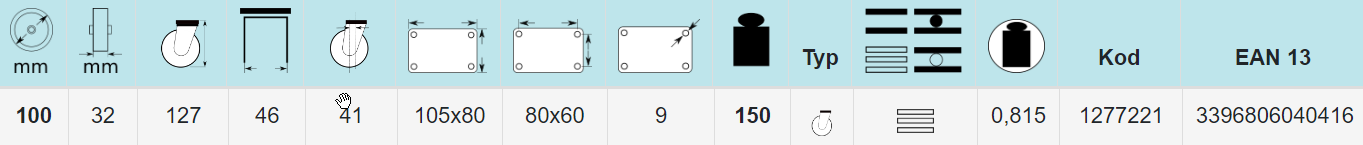 Obrotowe, obrotowe z hamulcem lub stałe. Stal tłoczona ocynkowana. Mocowanie na płytę. Głowica skrętna z dwurzędową prowadnicą kulek.